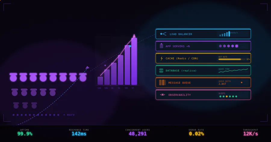 - Model bottlenecks: Identify constraints (database writes, cache hit rate, third-party API quotas, background workers).